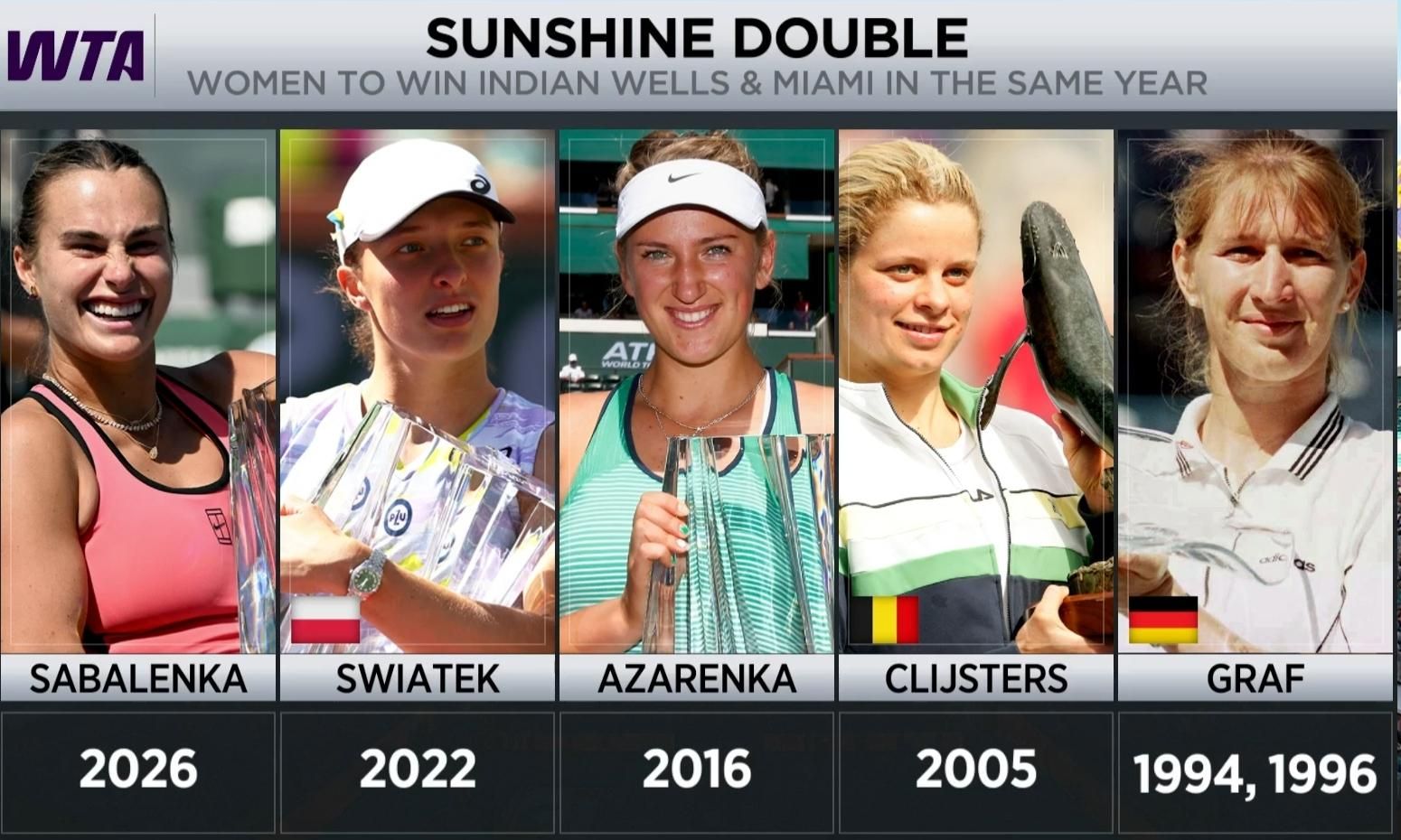 Non c'è stato solo il dominio azzurro in singolare. Il tabellone femminile se lo aggiudica ancora una volta Aryna Sabalenka, riuscendo a difendere il titolo dello scorso anno e portandosi a casa anche lei il Sunshine Double, dopo il successo ad Indian Wells. In questo caso, Aryna diventa solo la quinta donna nella storia a riuscirci, dopo leggende assolute come Graf, Clijsters, Azarenka e per ultima Swiatek nel 2022.