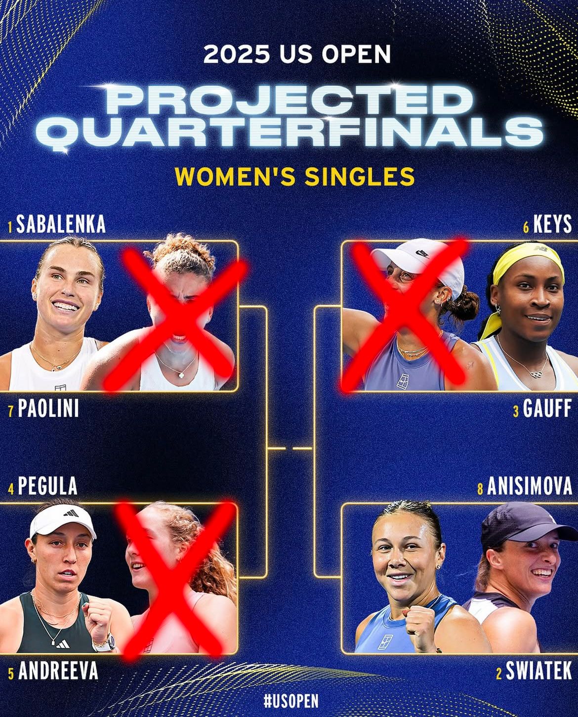 Manca una settimana per conoscere i vincitori dello Us Open 2025, ma prima riprendiamo il giochino di settimana scorsa ed andiamo a vedere quante delle prime 8 teste di serie sono cadute, ricordando però che per i quarti manca ancora una partita e, quindi, il conteggio potrebbe aggiornarsi nei prossimi due giorni.
