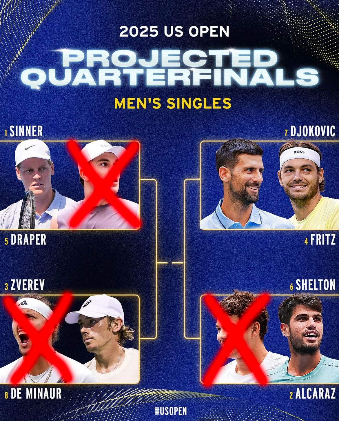 5 su 8 per il maschile: rimangono — ovviamente — Sinner e Alcaraz, poi De Minaur nel secondo quadrante e sia Djoker che Fritz nel terzo.
