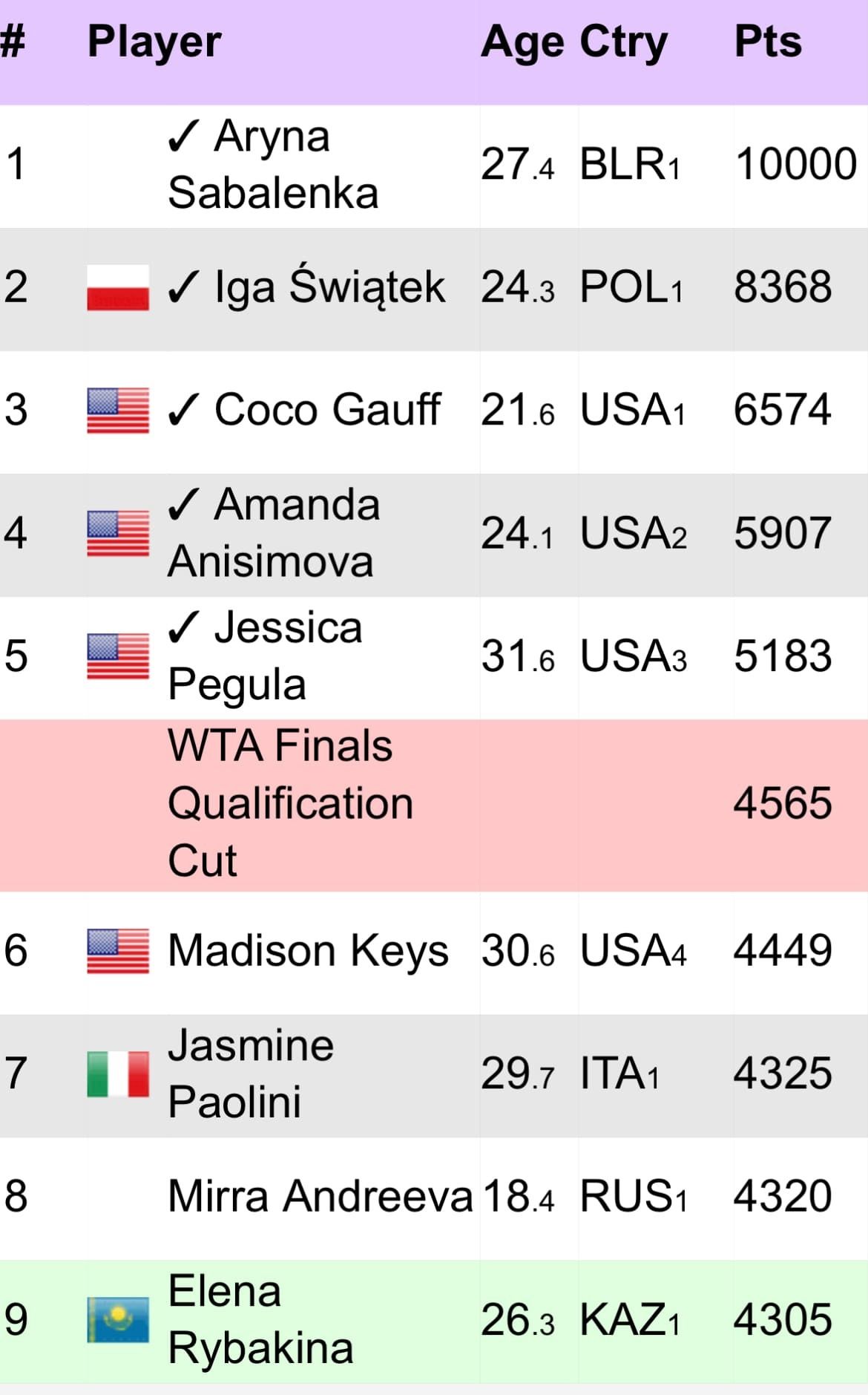 Anche se non è evidenziato nello screen, Jasmine Paolini ha la certezza matematica di essersi qualificata, perché Mirra Andreeva non risulta iscritta a nessun torneo della prossima settimana e di conseguenza non ha modo di scavalcare Jas.