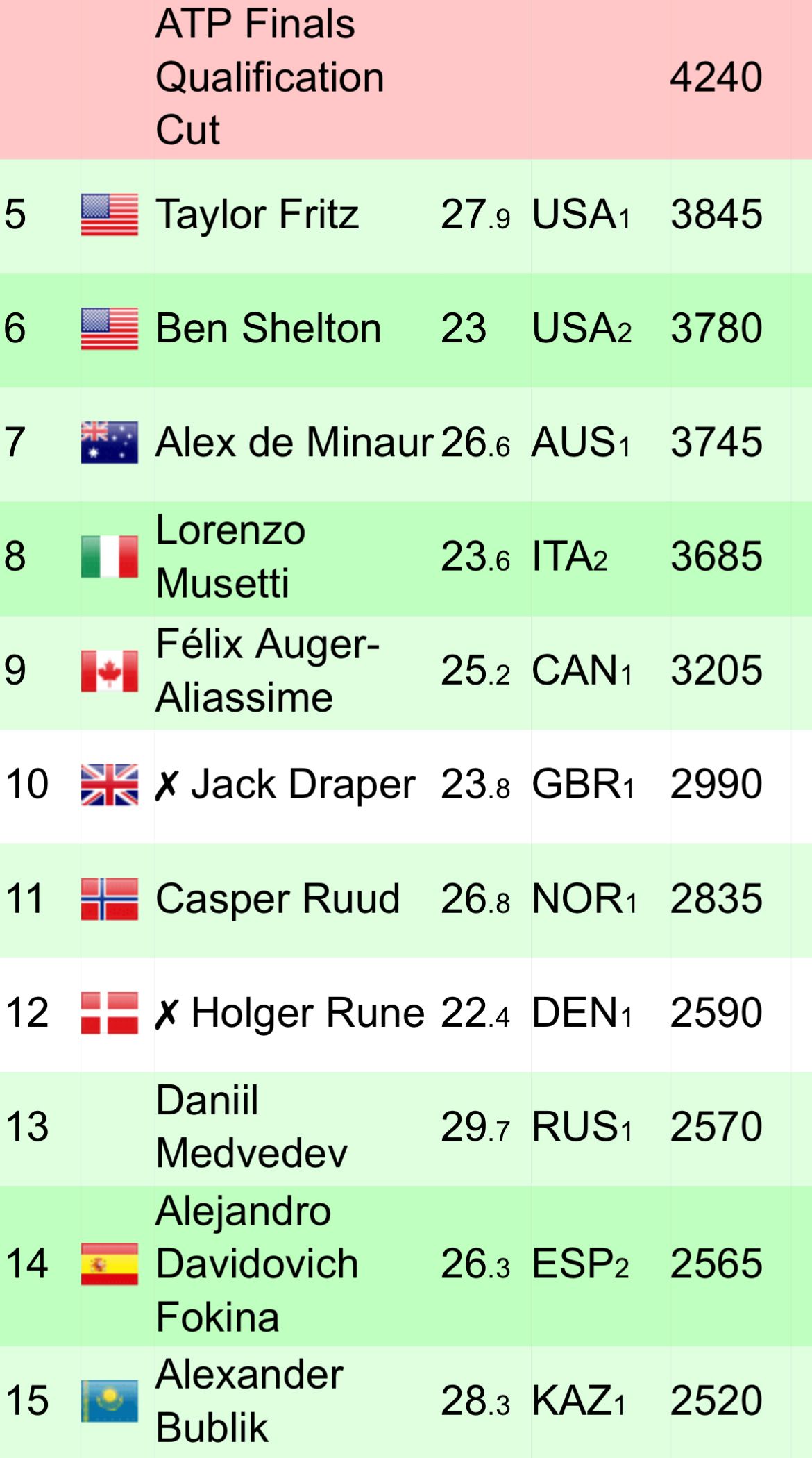 Oltre ai già qualificati Alcaraz, Sinner, Djokovic e Zverev, i 4 posti rimanenti se li lotteranno gli 11 (-2 infortunati: Draper e Rune) giocatori qui sotto:
